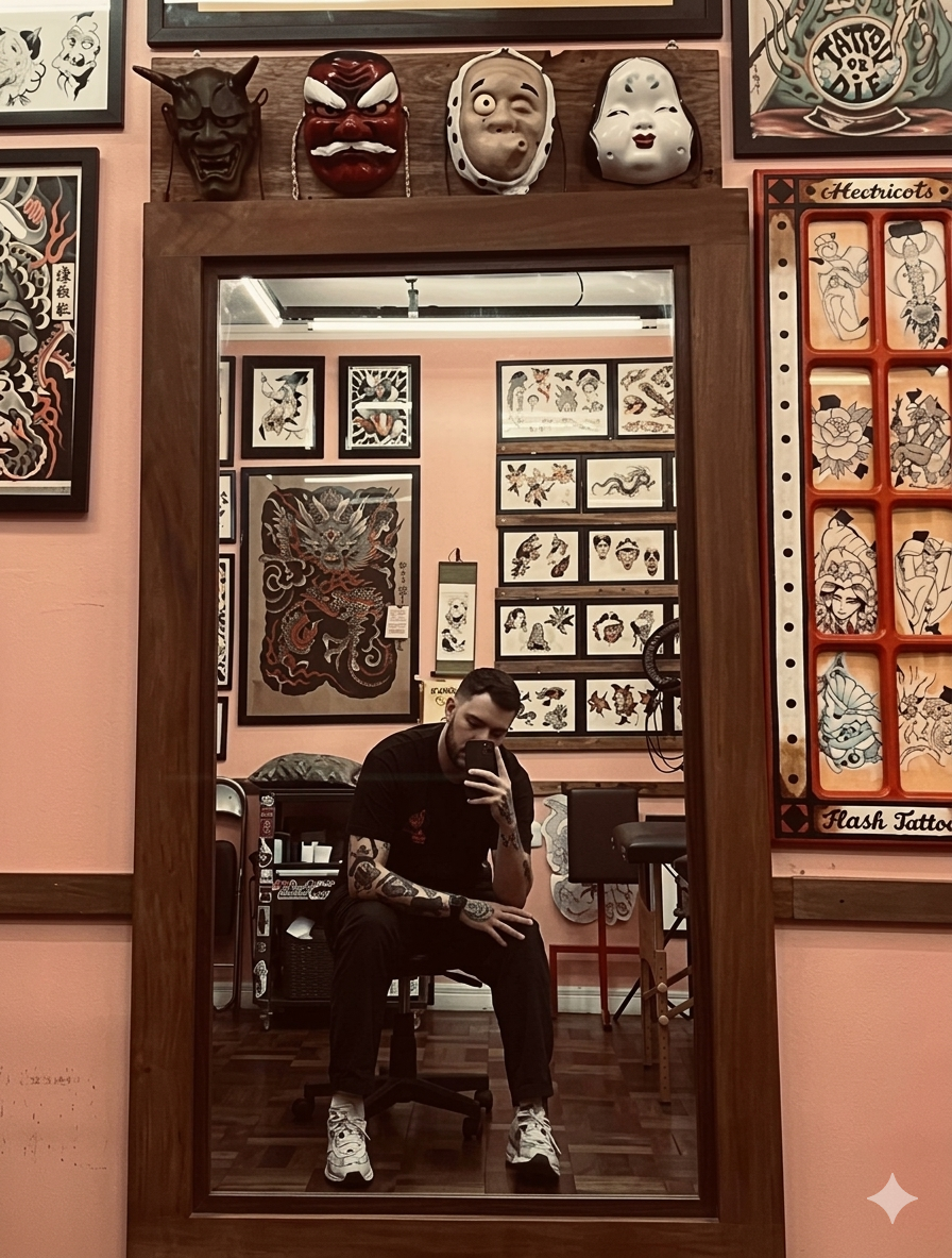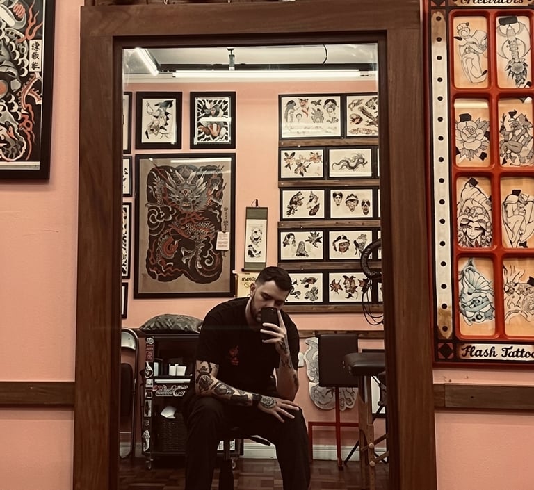 From the beginning of his journey Gabriel was drawn to traditional tattoos and the strong visual impact of large traditional Japanese body suits. Today his work is mainly focused on traditional tattooing, influenced by Europe, North America, Asia and Latin America. His attention to detail, respect for the history of tattooing and passion for the craft can be seen in every piece he creates and in his hand painted flash sheets.